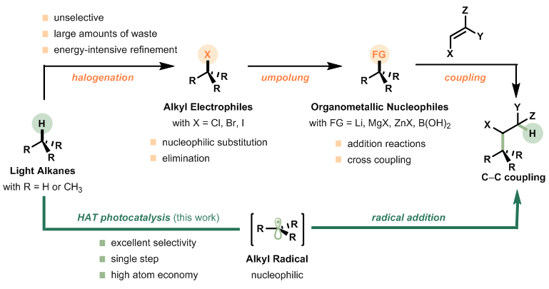 图 2. 气态烷烃C(sp3)–H键的光催化断裂产生亲核烷基,可避免使用卤代烷烃或有机金属试剂
