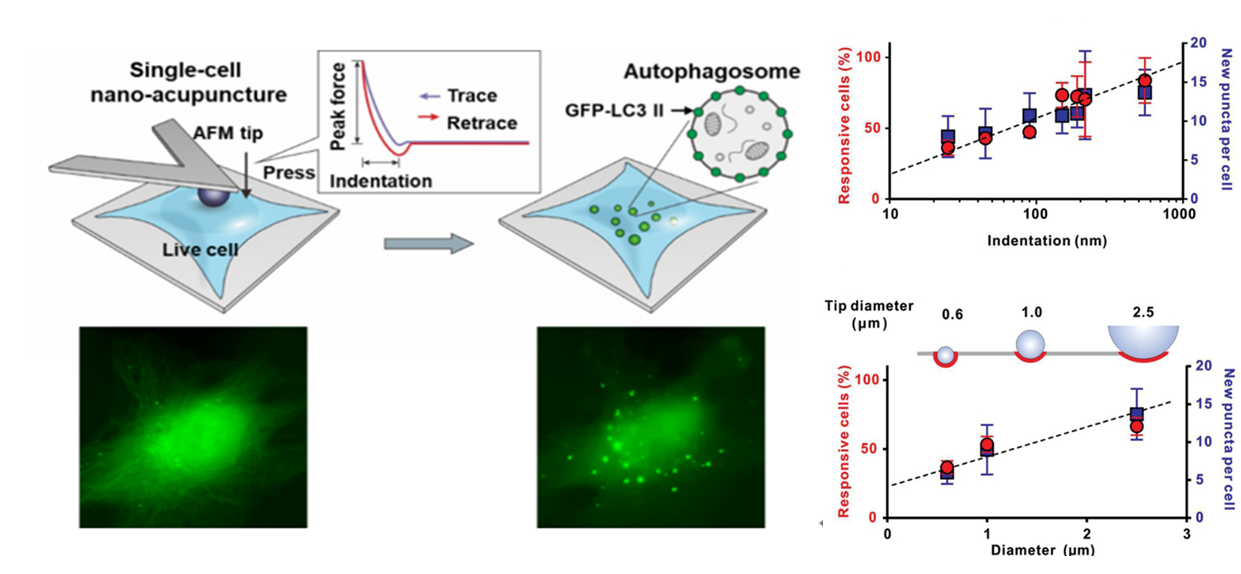 图1:“纳米针灸”:活细胞在原子力显微镜探针施加的纳米机械力刺激下产生自噬响应